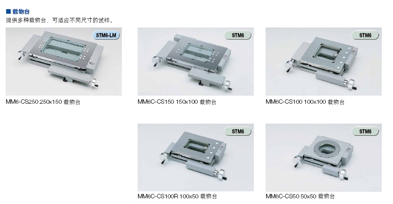 50X50mm,100X50mm,100X50MM,150x100MM多種行程載物臺可供選擇,適應(yīng)不同大小樣品的使用,更有250X150mm行程的大型載臺配套的STM7-LM型機(jī)臺,共超大樣品的使用