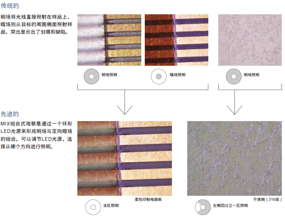 BX3M的MIX組合式觀察技術(shù)組合了明場和暗場照明方法。MIX組合式照明滑塊中的LED光源,以定向暗場光線照射樣品,這種方式類似于傳統(tǒng)暗場照明,但又具有更大的靈活性。這種明場與定向暗場的組合稱為MIX組合式照明,對突出顯示缺陷和區(qū)分隆起與凹陷表面很有用處。